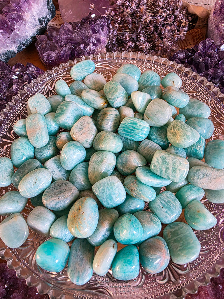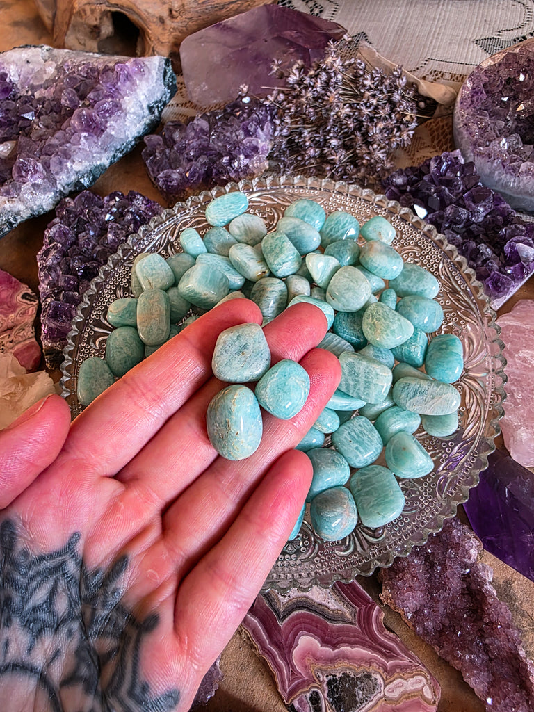 This listing is for a set of three small tumbled amazonite crystals as pictured. These tumbles are genuine amazonite and each feature unique natural qualities. You will receive 3 crystals similar to the ones photographed.