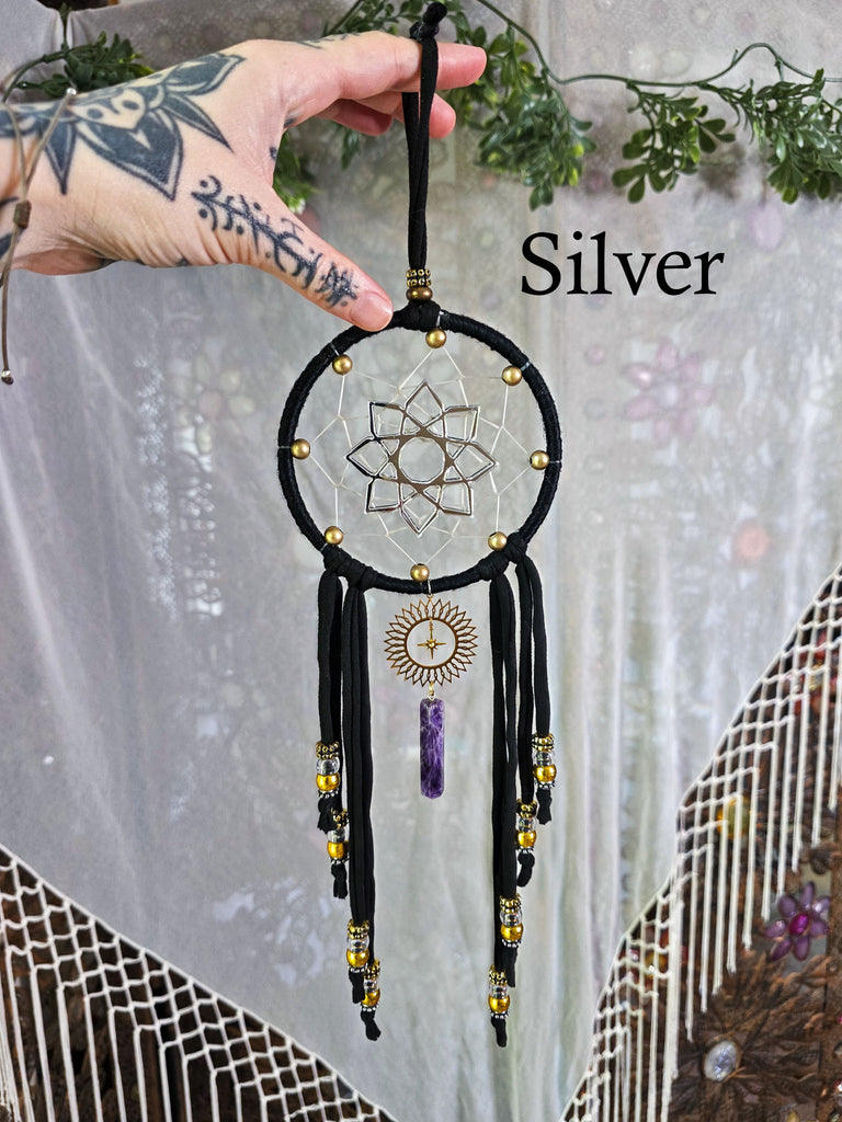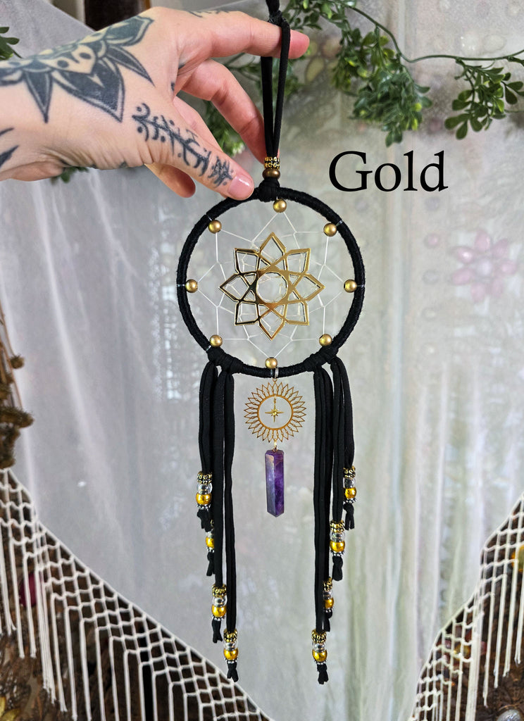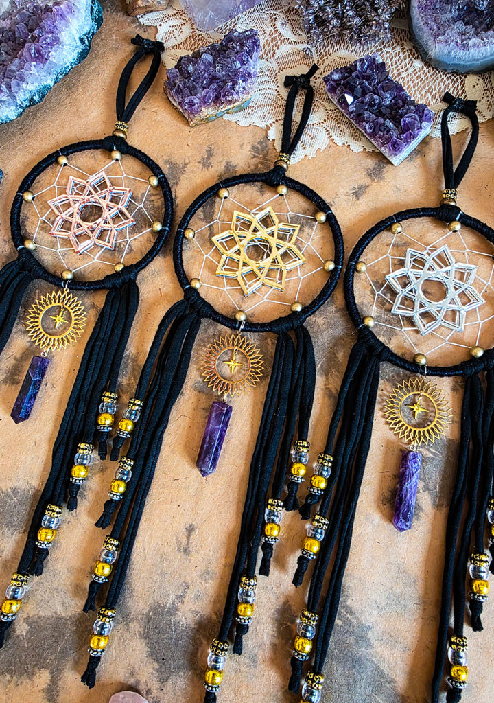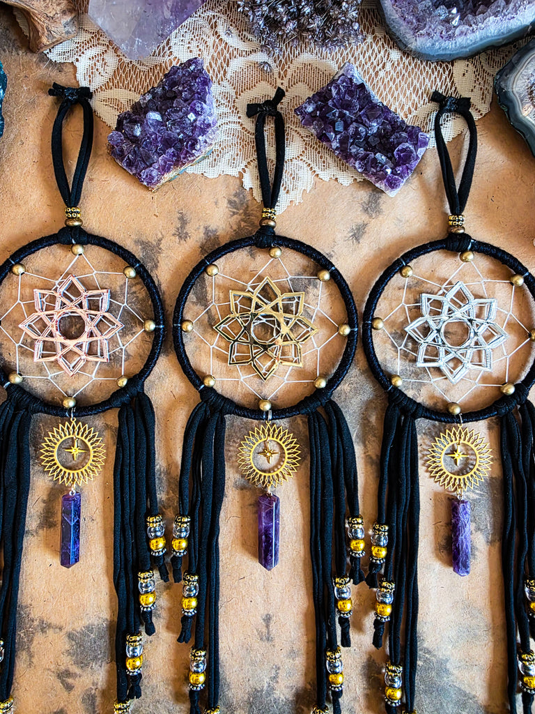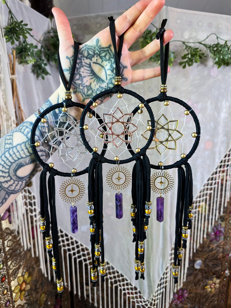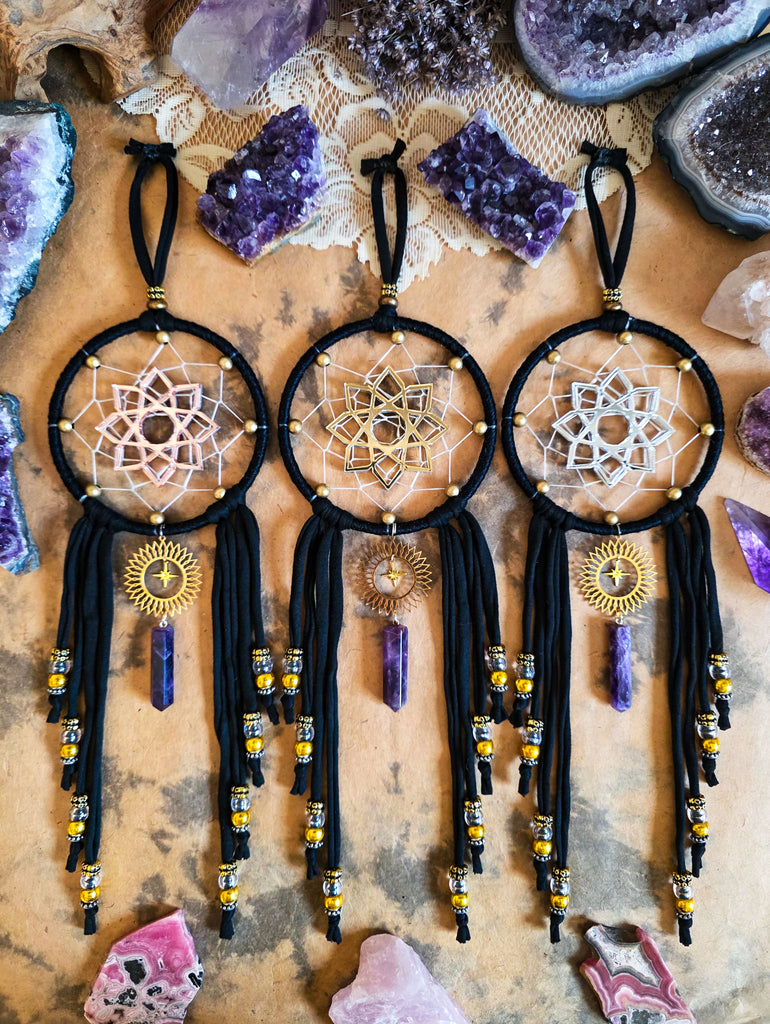 These sleek black dreamers are sure to be a wonderful addition to your home and sacred space! Each are designed with a traditional style dream catcher weave with brass metal beaded surrounding the edges. Custom made mirrored geometric symbols are adorned as the centers of each. The same geometric design is on both sides of this piece, making this easy and beautiful to display from any angel! Choose between rose gold, gold, or silver as your center geometric shape color. See photos for examples of each.