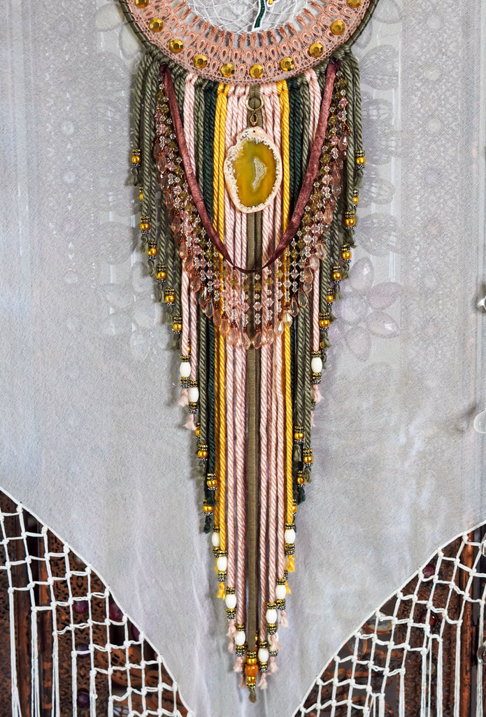 Attached below the ring hanging amongst the tassels is a lush yellow agate slice crystal. Agate is a mineral of the quartz family. This gem is formed in nearly all colors, from clear transparent crystals to banded stones of earthy hues. Its warm, protective properties encourage security and self-confidence. Also known to enhance mental function by improving concentration, perception, and analytical abilities. Used also as an excellent grounding stone.