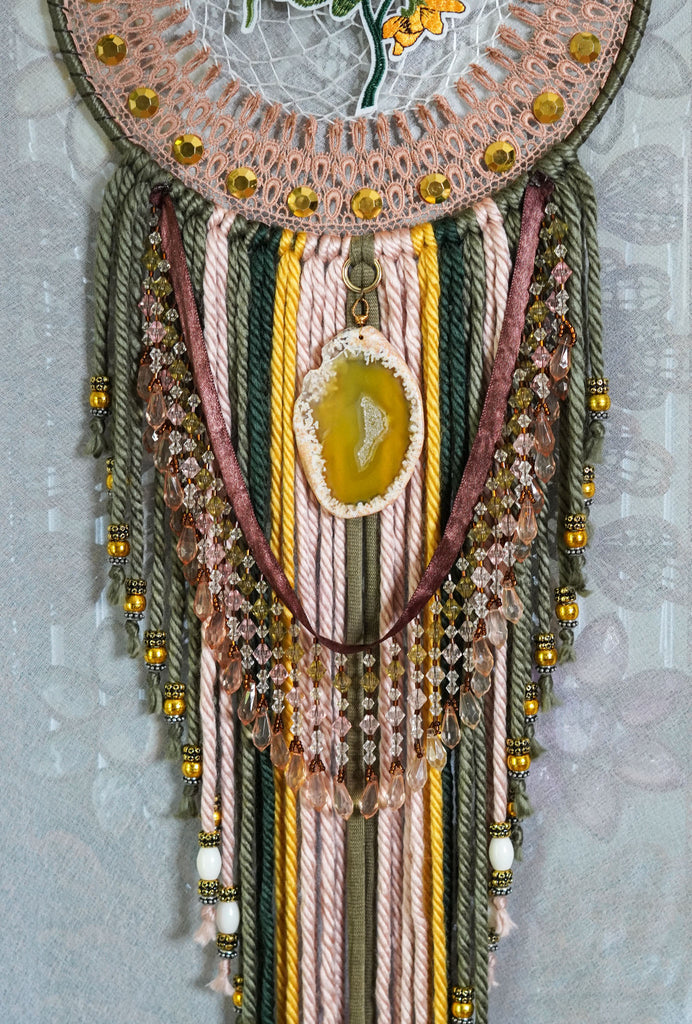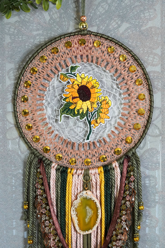 This joyful creation features a beautiful vibrant embroidered sunflower center. This sunflower is surrounded by white traditional style dream catcher webbing with a beautiful peachy mandala edge. This mandala pattern features gold rhinestones surrounding the edges.