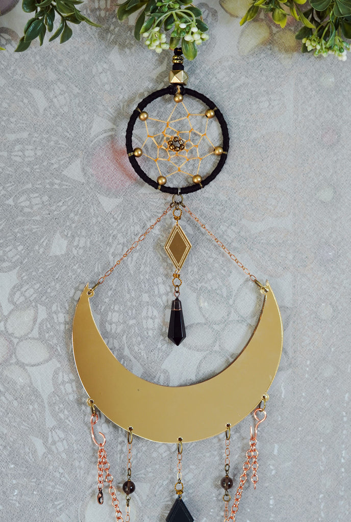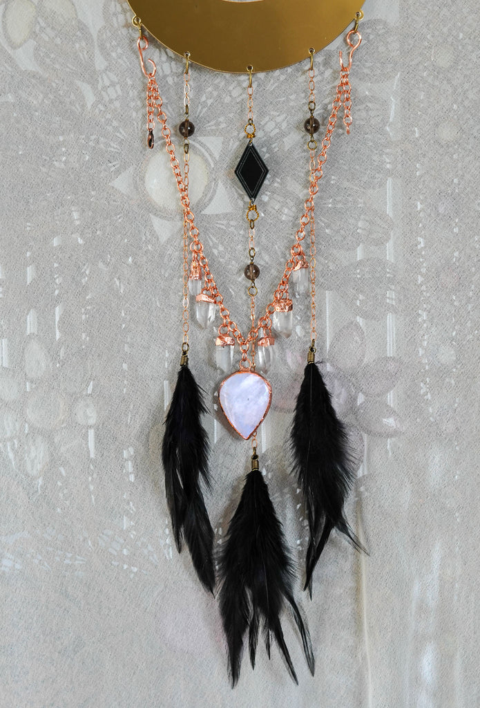 This enchanting creation features a shiny golden crescent moon with a detachable custom quartz and moonstone crystal statement choker with various design details throughout. This moon is double sided and made out of a shiny mirror acrylic. Hanging above the moon is a traditional style dreamer ring with brass and glass bead details. Attached below this ring hangs a black obsidian crystal pendulum. Smokey quartz crystal bead details are adorned throughout the bottom hanging components. Fluffy black rooster feathers are decorated along the very bottom.