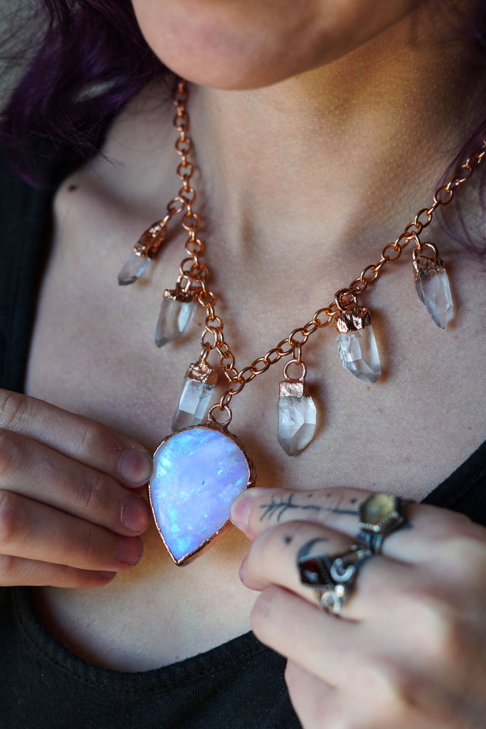 The strand of quartz and moonstone crystals is a detachable necklace made by Xtwii. This necklace is made up of six quartz and a moonstone crystal topped with copper using a technique known as electroforming, and hung from a bright copper chunky chain that lays at choker length with a simple clasp.