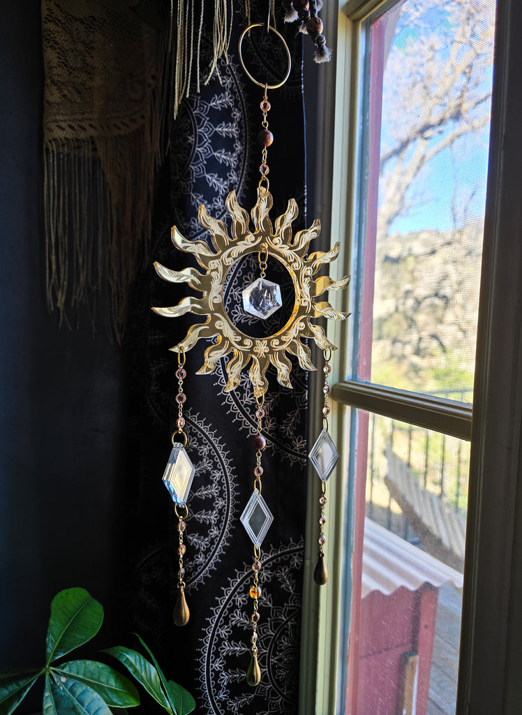 This joyful piece features a custom made sun ray design with three dangling strands of diamond cuts, crystals, and bronze droplet details. The sun represents life, growth, and renewal. Often serving as a symbol of joy and abundance. This piece is double sided and made out of a mirrored gold acrylic with engraved details. A beautiful clear quartz crystal hexagon hangs from the center of this sun. Three custom made silver mirrored diamond shapes hang amongst the dangling strands below this piece. Goldstone and citrine crystal beads are adorned in various segments.