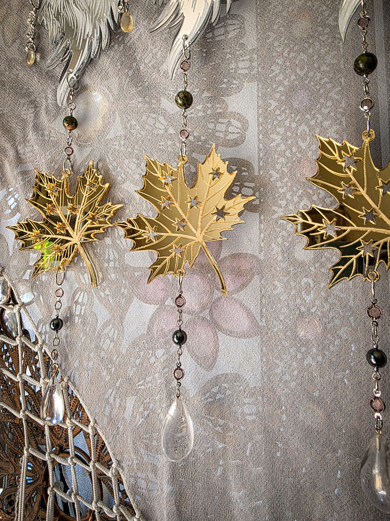 This enchanting piece features a shiny silver wolf howling at a full moon with starry gold maple leaves on top and bottom with crystal details throughout. Wolves are powerful spirits who symbolize freedom and independence, representing the untamed wild, as well as leadership and resilience in overcoming challenges. This piece is double sided and made out of mirrored acrylic. Unakite jasper, clear quartz, and hematite crystal beads are decorated throughout segments in this design. A small golden droplet hangs from the ear of the wolf. Hanging from the very bottom is a clear quartz crystal droplet.
