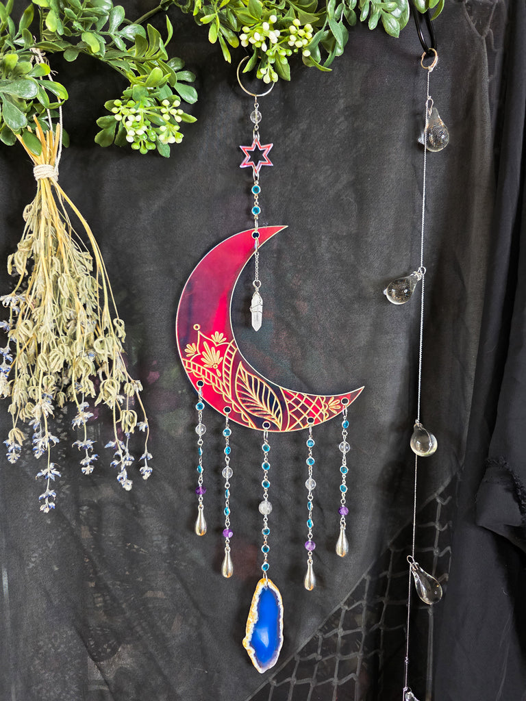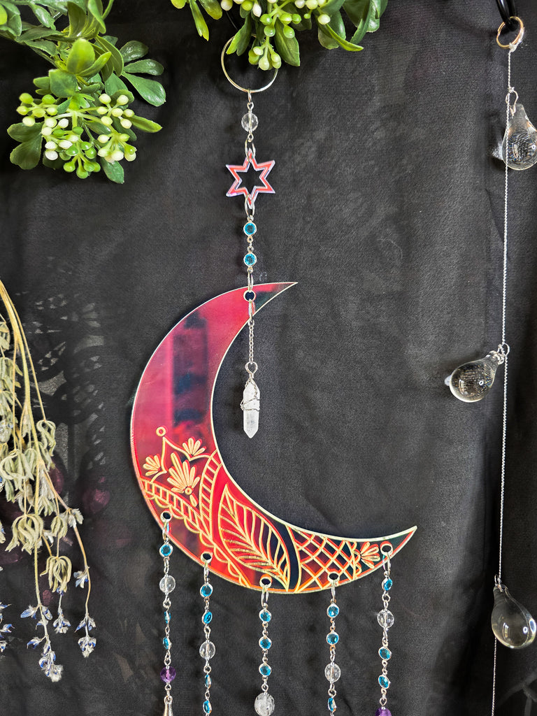 This magical piece features a custom made crescent moon design with an iridescent star above and dangling strands of crystals and beads below. Across various cultures the moon symbolizes change, connection to the divine feminine, intuition, mystery, and guidance through darkness. This piece is double sided and made out of a highly reflective iridescent mirror-like acrylic material. Sure to reflect sparkly rainbows off into any room with light exposure. A beautiful wire wrapped quartz crystal point hangs from the top point of the crescent. Amethyst, clear quartz, and rutilated quartz crystal beads are adorned in various segments. Hanging from the end of the center chain is a beautiful agate slice crystal.