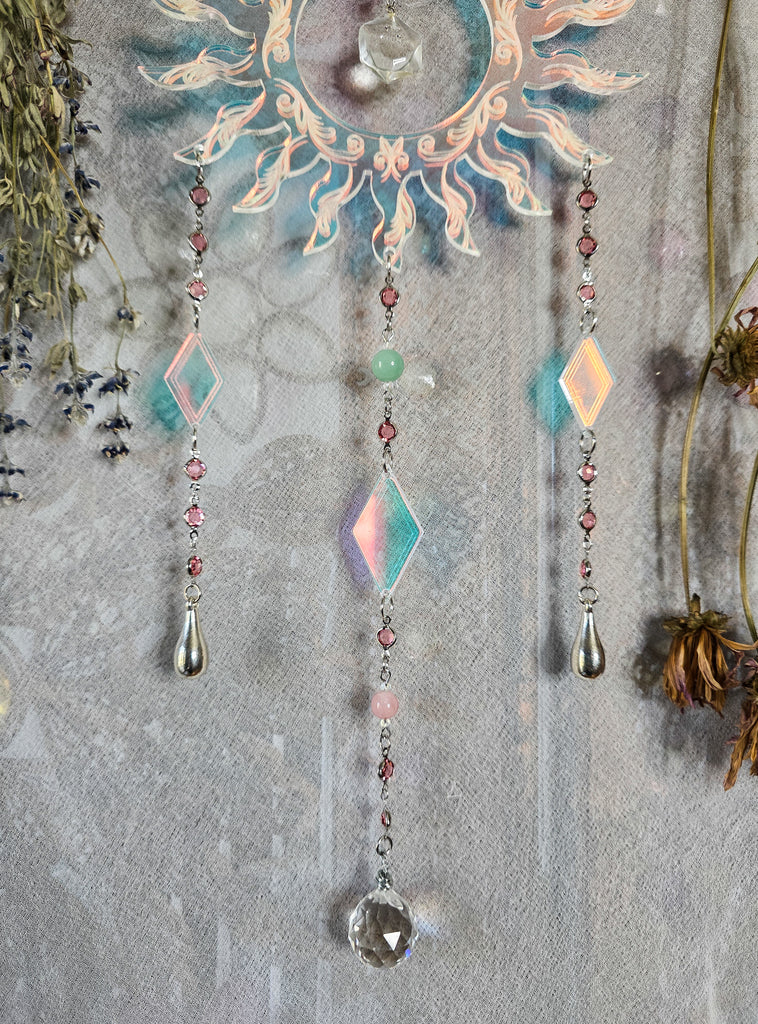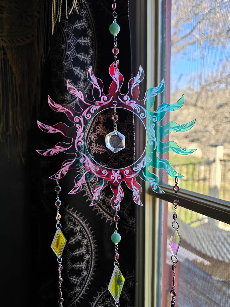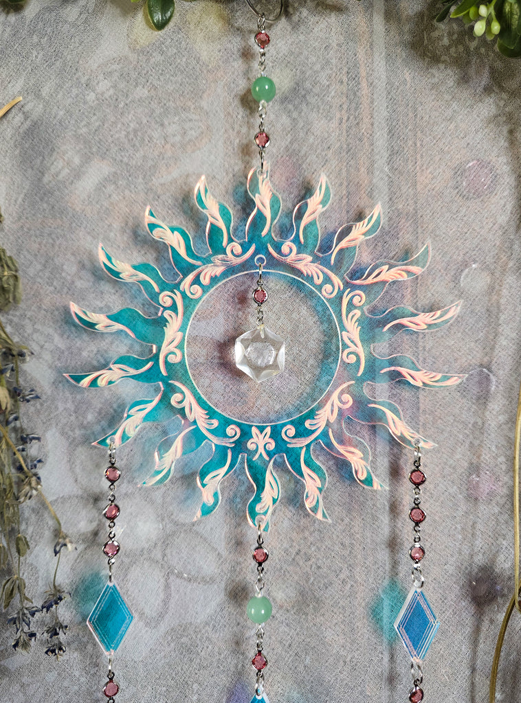 This radiant piece features a custom made sun ray design with three dangling strands of diamond cuts, crystals, and droplet details. The sun represents life, growth, and renewal. Often serving as a symbol of joy and abundance. This piece is double sided and made out of a highly reflective iridescent mirror-like acrylic material. Sure to reflect sparkly rainbows off into any room with light exposure. A beautiful clear quartz crystal hexagon hangs from the center of this sun. Three custom made iridescent diamond shapes hang amongst the dangling strands below this piece. Hanging from the end of the center strand is a reflective glass crystal orb. Fluorite and green aventurine crystal beads are adorned in various segments.