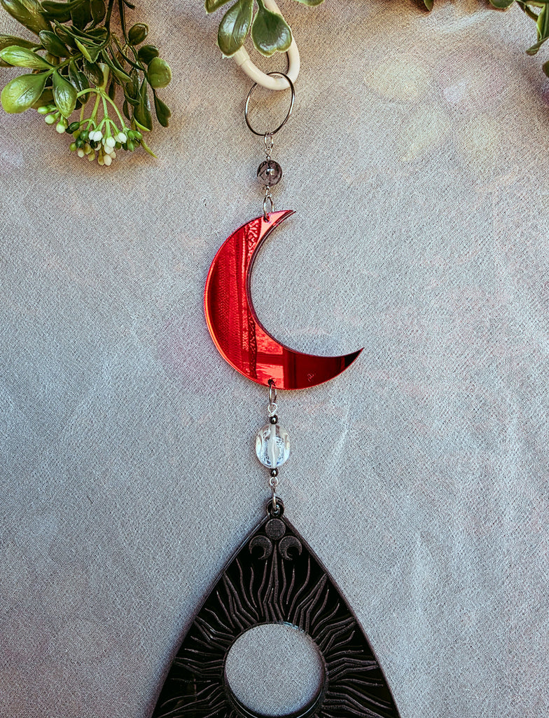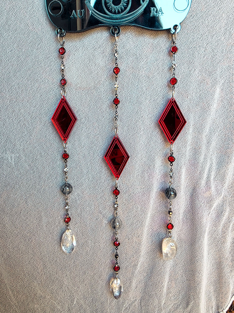 This gothic piece features a black shiny planchette design with a ruby red crescent moon up top and dangly crystal chains below. The planchette represents a special spiritual tool used in "spirit writing" - a paranormal route to seek advice from the other side. This piece is double sided and made out of mirrored acrylic. Clear quartz and tourmalated quartz crystal beads are decorated throughout segments in this design. Hanging from the very bottom of this piece are clear quartz crystals.