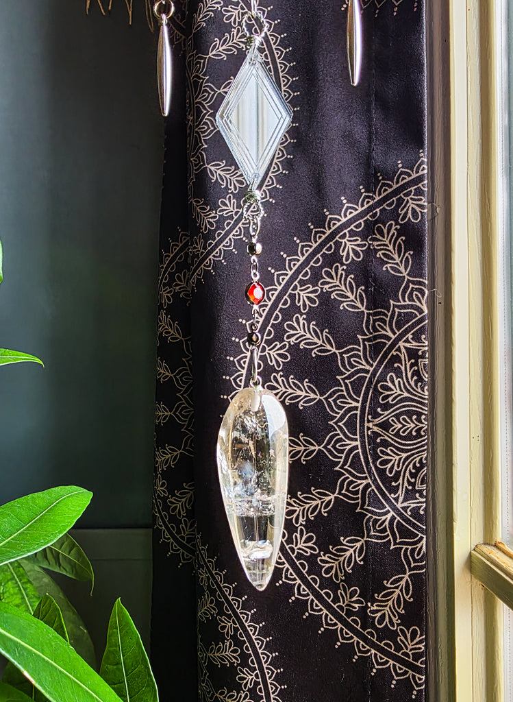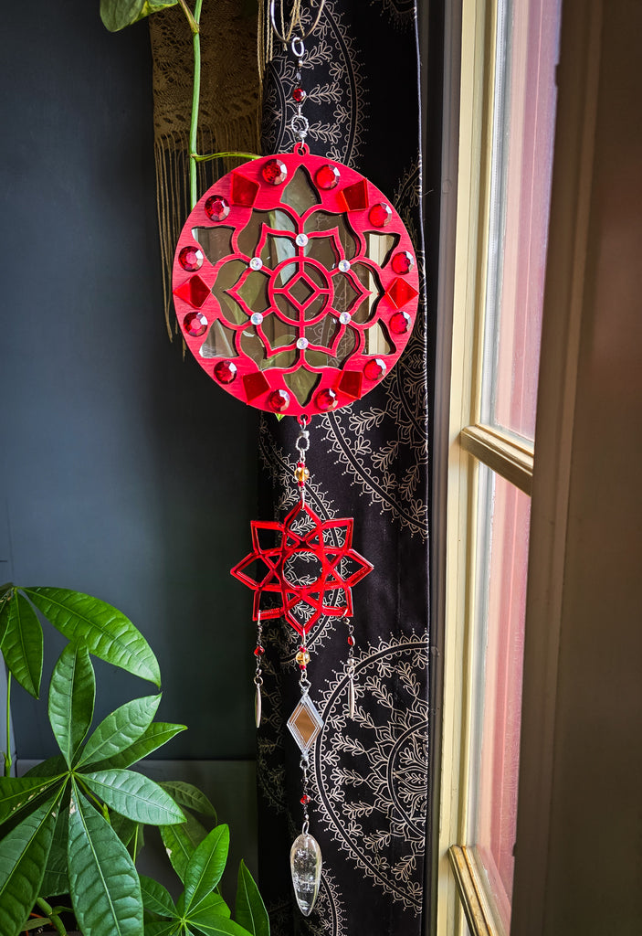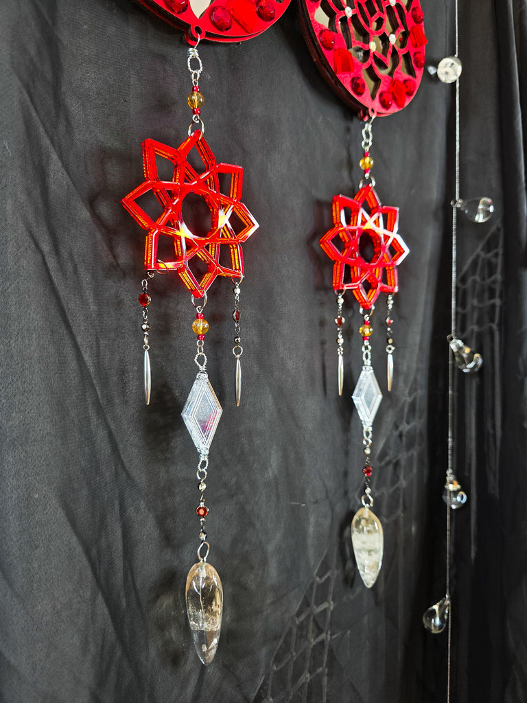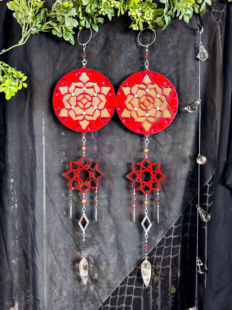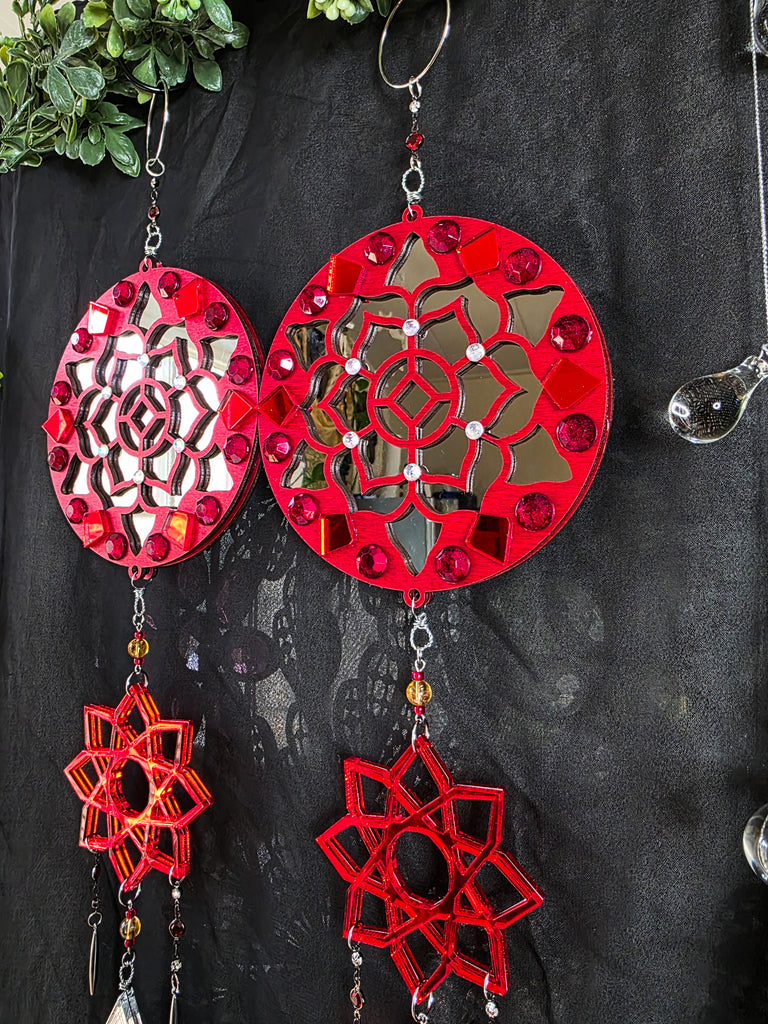This striking design features a custom made mirrored red mandala with various decorative details and crystals hanging below. These pieces are doubled sided and perfect to hang suspended or against any wall. The top mandala designs are made with a two-way mirror which shines a beautiful reflection of light. Surrounding the edges are jeweled red details. Hanging below the top mandala is a mirrored red mandala with a mirrored diamond cut and quartz crystal pendulums hanging from the very end.