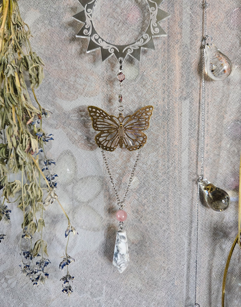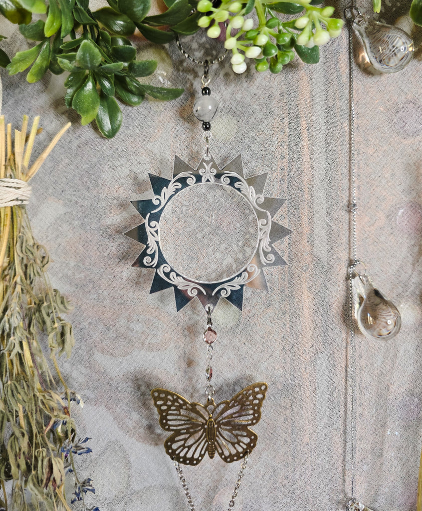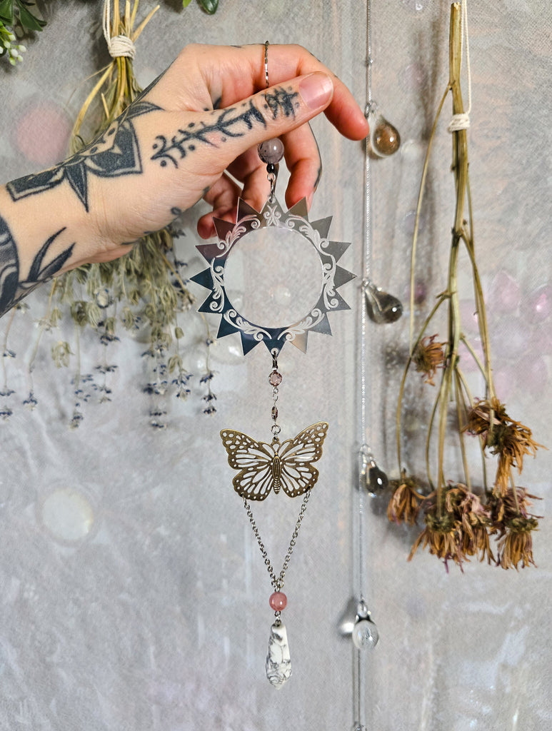 This dreamy sun totem is sure to bring joy and warmth to your realm! Designed with a custom made shiny silver mirrored sun with engraved details. Hanging below the sun is a beautiful metal butterfly. Hanging below the butterfly is a fluorite crystal bead with a howlite crystal pendulum. A rutilated quartz crystal bead is attached on top between the sun and metal hanging loop.