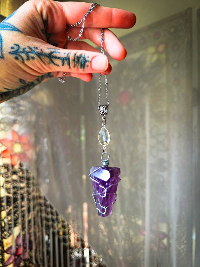 This necklace features a beautiful juicy amethyst crystal paired with a lovely facetted topaz crystal connector gem. This amethyst is top notch quality exhibiting a gorgeous shine and rich hue of color. This piece is wire wrapped in silver wire. All strung along a silver chain and ended with a lobster clasp closure.