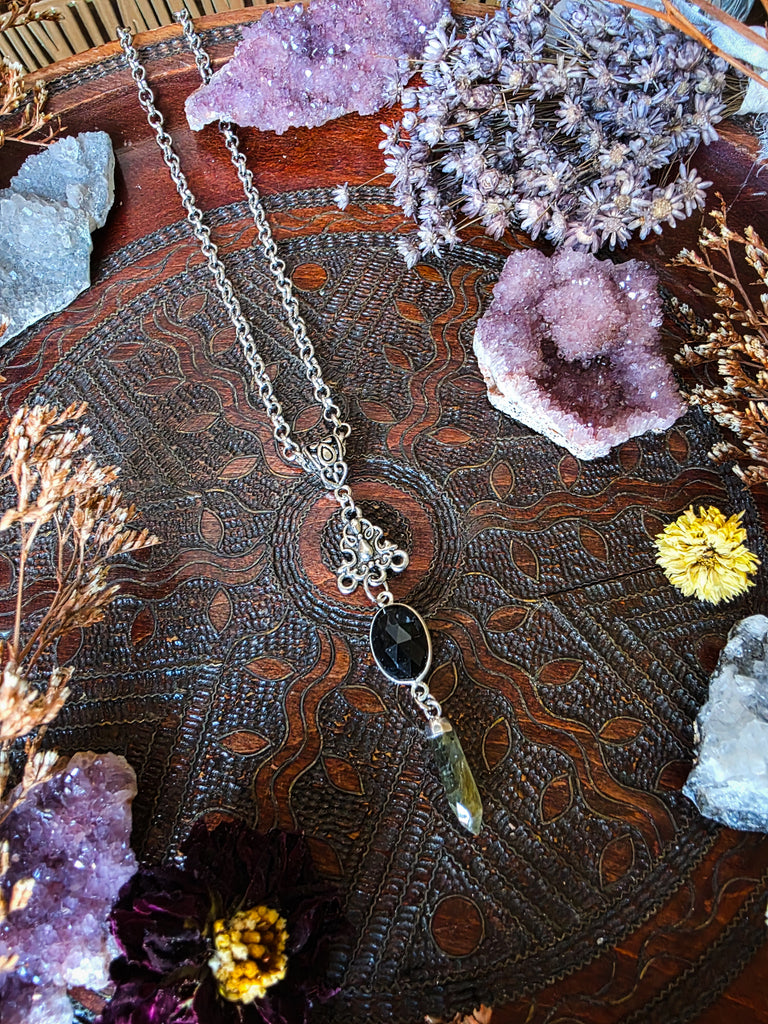 This elegant necklace design features a staggering silver ornate charm with a black obsidian and a labradorite crystal point hanging in a row. The obsidian and labradorite are both faceted with a beautiful quality and shine. All strung along a silver chain and ended with a lobster clasp closure.
