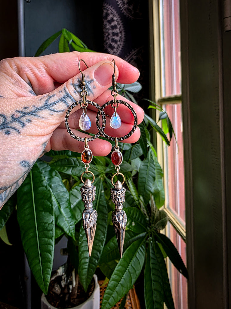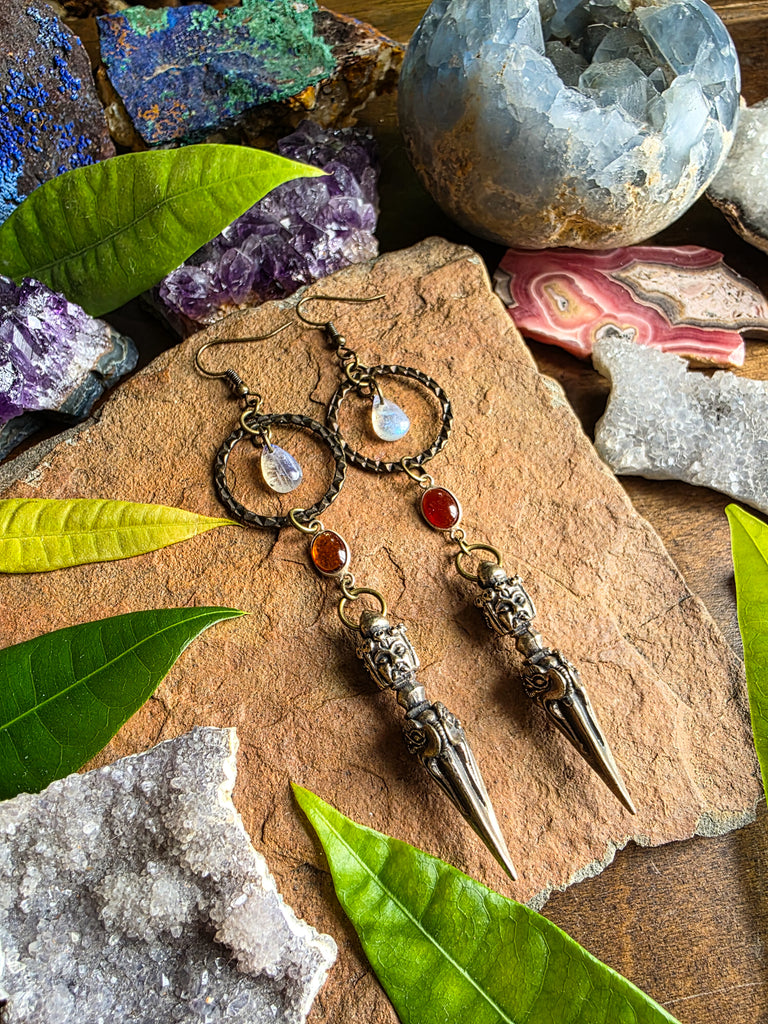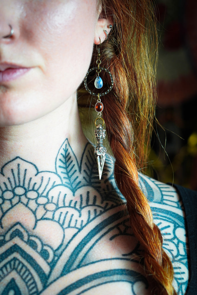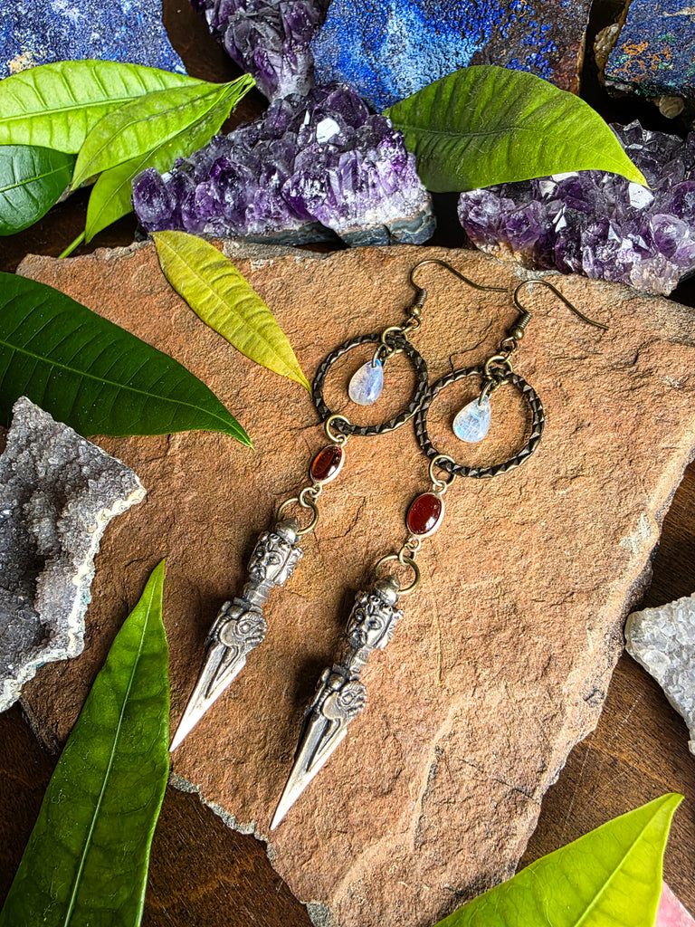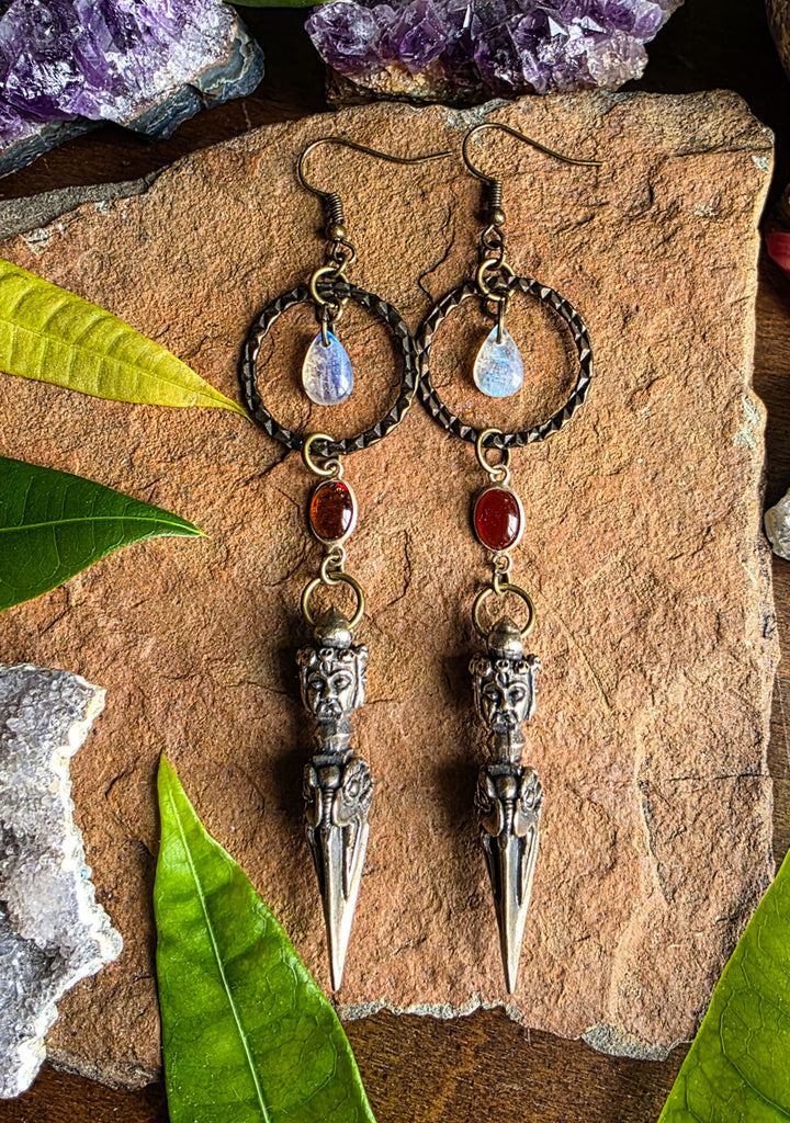 These unique earrings feature staggering design elements with beautifully detailed Phurba dagger pendants hanging from each. The Phurba dagger is used in Tibetan Buddhism and is tied to dispelling negative energies and destroying obstacles. The triple edged blade represents the overcoming of the three positions symbolizing ignorance, greed, and hate. These daggers are attached to small Carnelian crystal connectors. Hanging within the centers of the metal brass hoops are flashy labradorite crystal droplets.