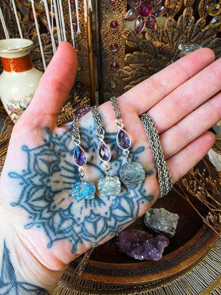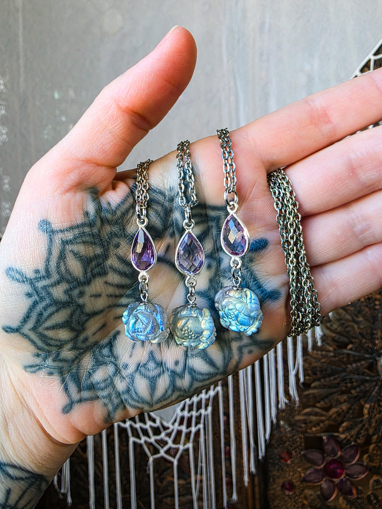 This charming necklace design features a beautiful amethyst crystal with a carved rose labradorite crystal hanging below. The amethyst is faceted with a beautiful quality and shine. Each of the carved labradorite roses have a beautiful flash of color and are detailed all around. Each is strung along a silver chain and ended with a lobster clasp closure.