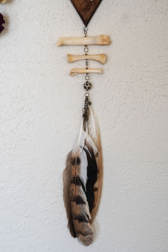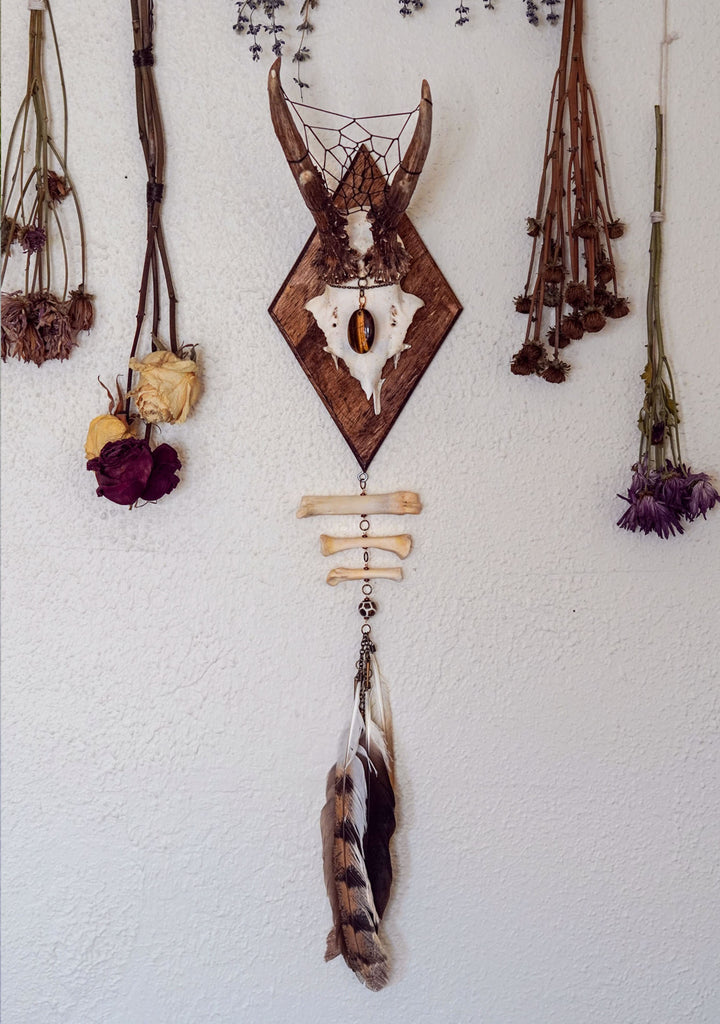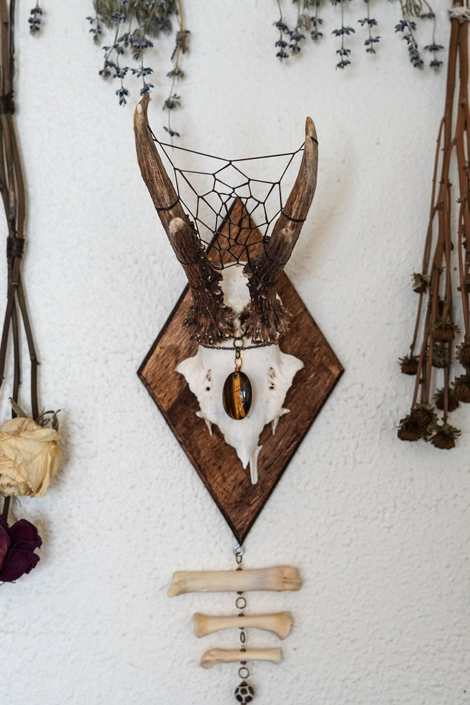 This cryptic creation features a roe deer skull mounted to a diamond shaped wooden plaque. On the backside is hanging hardware for easy hanging display. The roe deer skull features traditional dream catcher webbing between its horns. A shiny tigers eye crystal hangs from the center forehead of the skull. Hanging below the plaque is a staggering trio of wild boar bones with raven and hawk feathers hanging beneath.