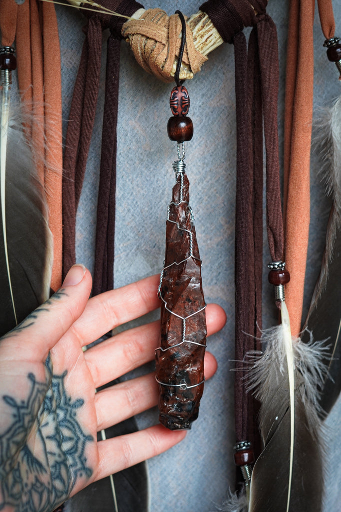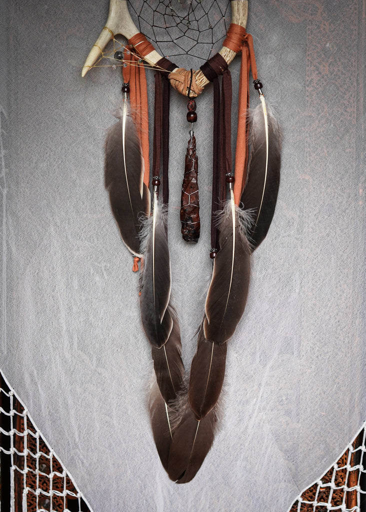 This dynamic creation features two naturally shed deer antlers conjoined with dream catcher webbing within its open middle. Crystal beads are woven into the webbing of this design. Within the very middle hangs a flashy labradorite crystal droplet. Dream catcher webbing is woven in between the small open segments of the antlers on both sides. Hanging directly below the center of this piece is a wire wrapped mahogany obsidian blade. Tassels decorate on both sides with decorative beads and plump natural goose feathers.