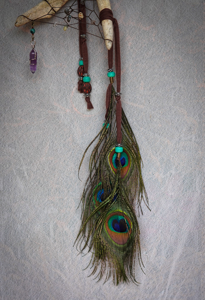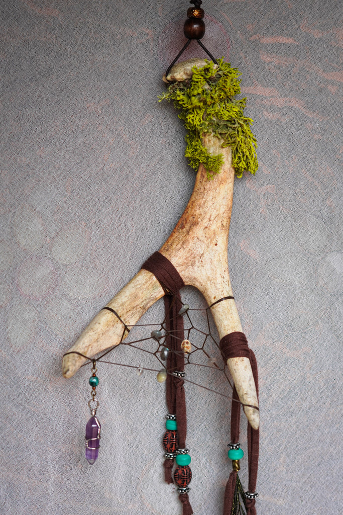 This woodsy creation features a naturally shed deer antler transformed into a dream totem. Beautiful natural moss decorates this piece inspired by the magic of the forest. Dream catcher webbing is woven in between the open segment of the antler with labradorite crystal beads and one small bone carved skull bead in the center. Hanging from the end of one point is a wire wrapped amethyst crystal point. Decorated below are a variety of staggering brown tassels with decorative beads and vibrant peacock feathers.