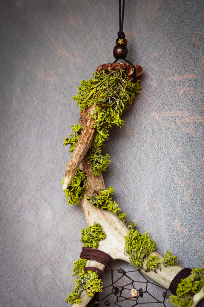 This woodsy creation features a naturally shed deer antler transformed into a dream totem. Beautiful natural moss decorates this piece inspired by the magic of the forest. Dream catcher webbing is woven in between the open segment of the antler with smokey quartz crystal beads and one small bone carved skull bead in the center. Hanging from the end of the webbing is a wire wrapped amethyst crystal point. Decorated below are a variety of staggering brown tassels with decorative beads and vibrant peacock feathers.