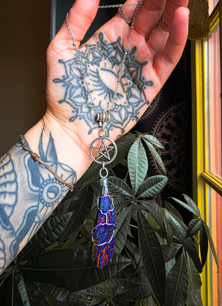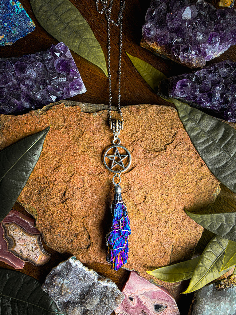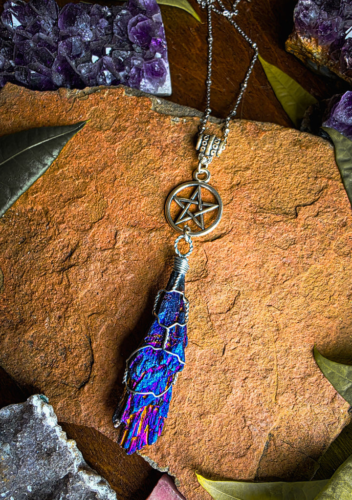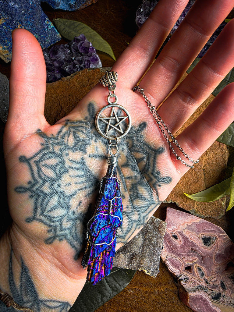 This necklace features a colorful aura kyanite crystal paired with a silver pentacle star charm. This kyanite is wonderfully captivating to the eye. This piece is wrapped in silver wire. The pentacle star is a symbol of protection, wholeness, and the elements of Earth, Air, Fire, Water, and Spirit. All strung along a silver chain and ended with a lobster clasp closure.
