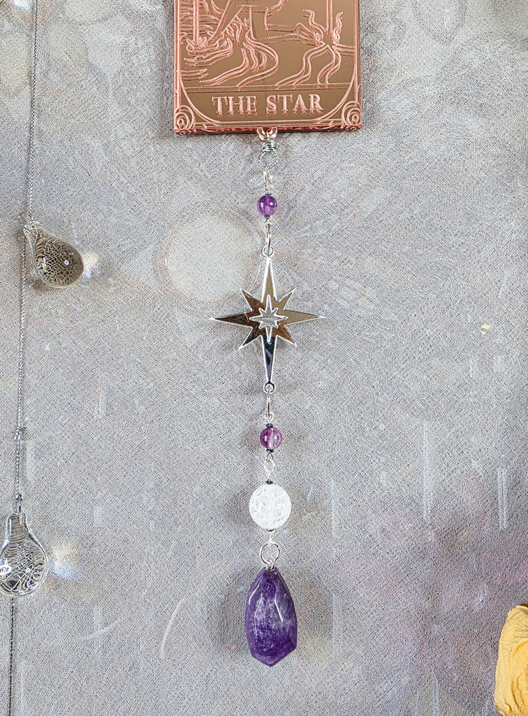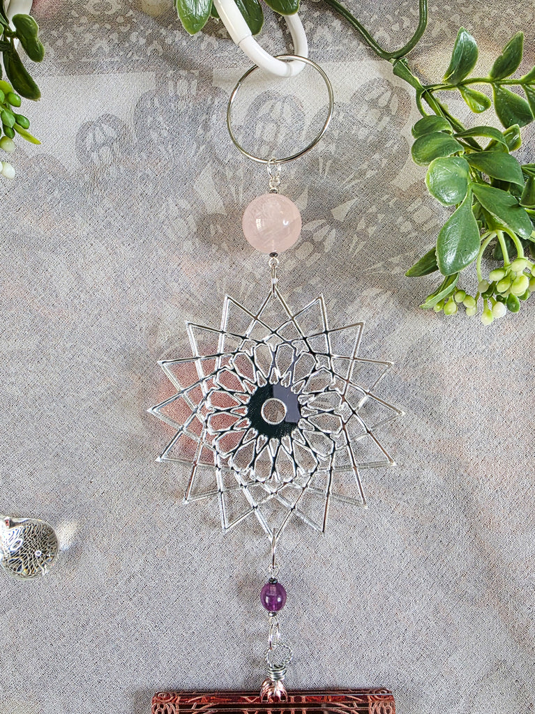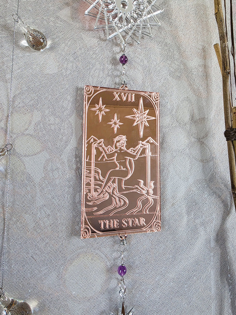 This piece is sure to bring forth magic to your home and sacred space! Featuring a rendition of The Star card of the tarot deck. This card design is custom and made out of a shiny rose gold mirrored acrylic. Hanging above and below this card is a custom made silver geometric mandala and star shape. Connecting each of the segments together are a rose quartz bead, purple fluorite beads, and a large crackle quartz crystal bead. All components apart of this design are double sided. Designed to hang suspended in any space or perfect to hang flat against any wall.